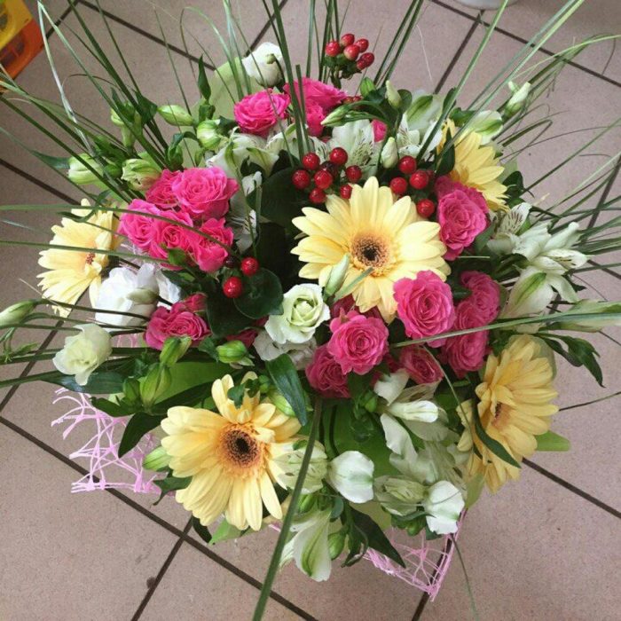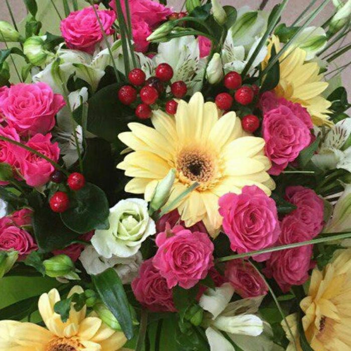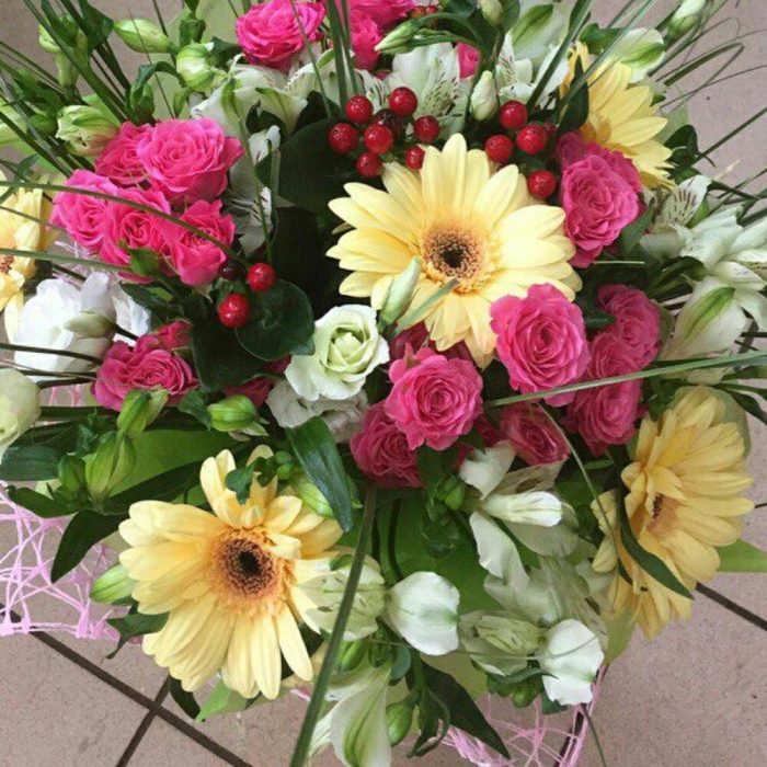 Берграсс – 3 шт. Роза кустовая розовая – 4 шт. Гербера кремовая – 5 шт. Альстромерия Микс Европа – 4 шт. гипериекум – 4 шт. лизаантус белый – 3 шт.