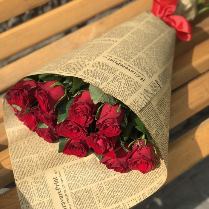 Классический букет из 15 Красных роз, стильно упакованный в бумагу Крафт.