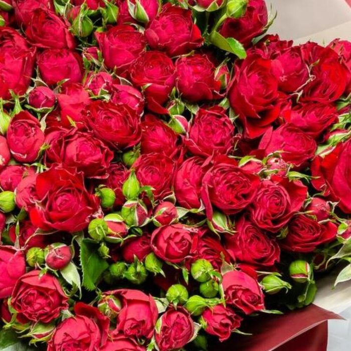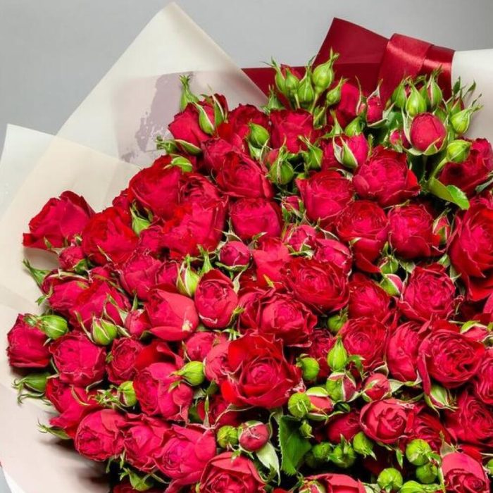 Роза кустовая – 29 шт.Упаковка дизайнерская – 2 шт.Лента атласная – 2 шт.Открыточка с вашими пожеланиями – 1 шт.хорошее настроение – 100 шт.инструкция по уходу за цветами – 1 шт.коробка переноска – 1 шт.Кризал – 1 шт.