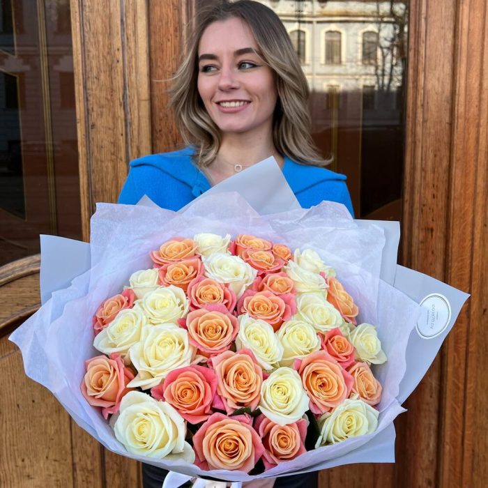 Роза белая 60 см – 16 шт.Роза коралловая 60 см – 19 шт.Дизайнерская упаковка – 3 шт.Тишью – 5 шт.Лента атласная – 2 шт.