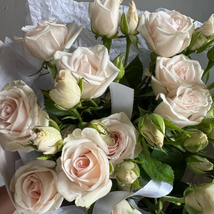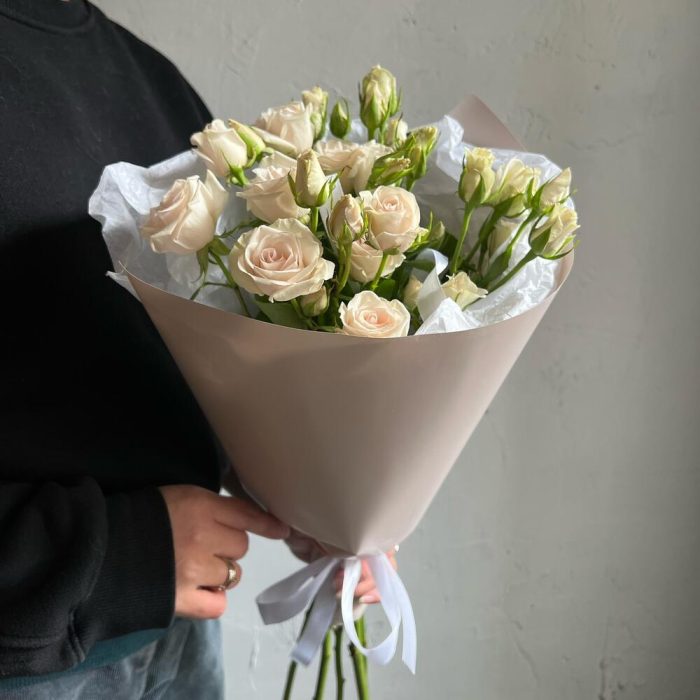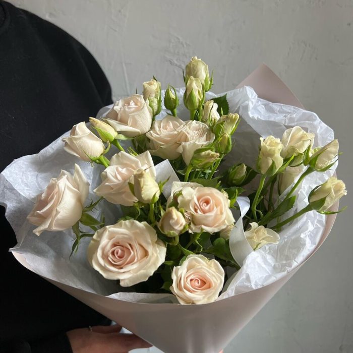 Роза кустовая – 5 шт.Лента атласная – 2 шт.Упаковка дизайнерская – 2 шт.