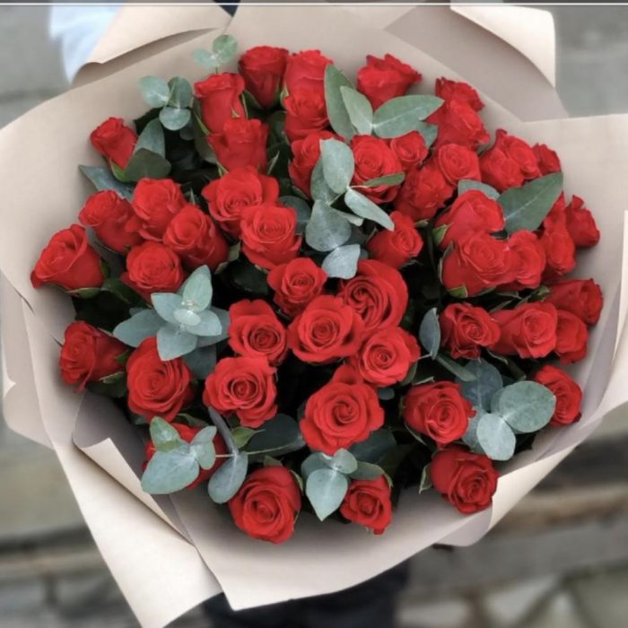 розы – 51 шт.дизайнерская упаковка и атласная лента – 1 шт.