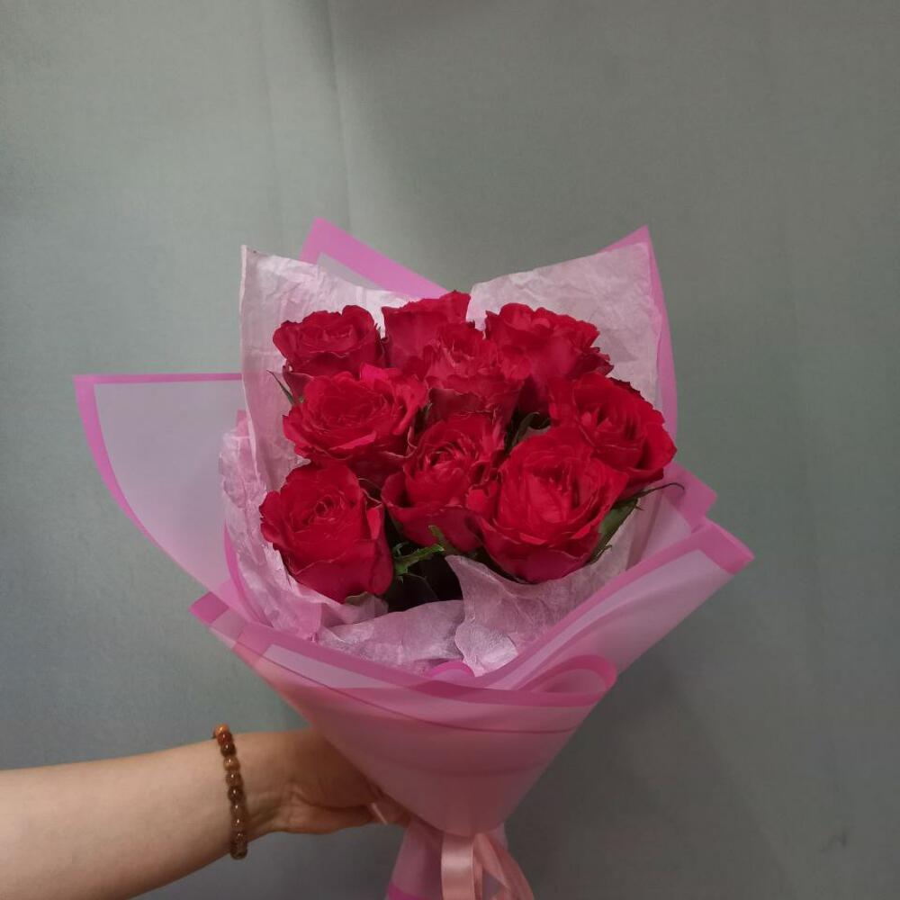 кенийская красная роза 40 см – 9 шт.Тишью – 1 шт.Корейская пленка – 1 шт.Атласная лента – 1 шт.