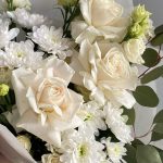 Букет из белых роз, хризантемы и эустомы