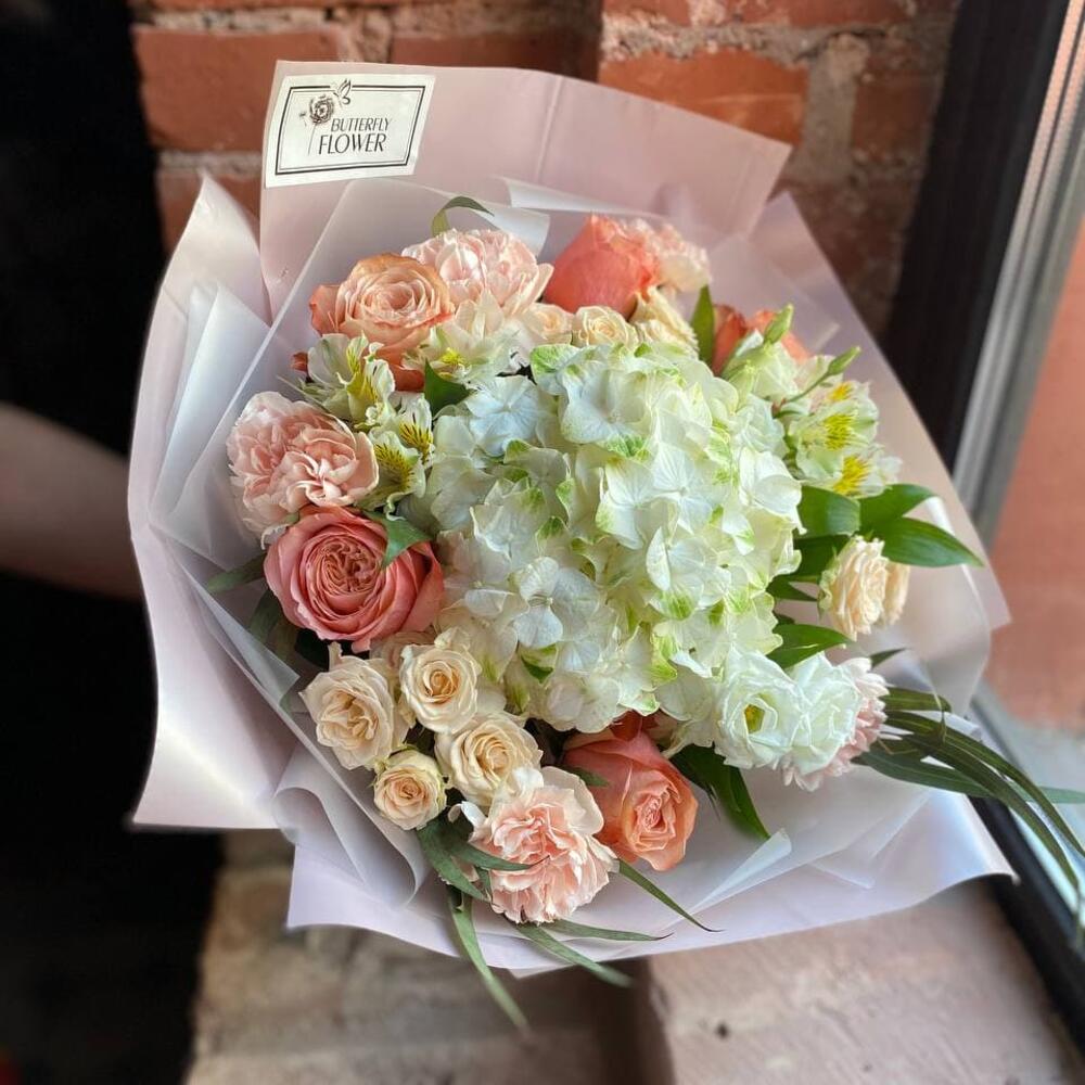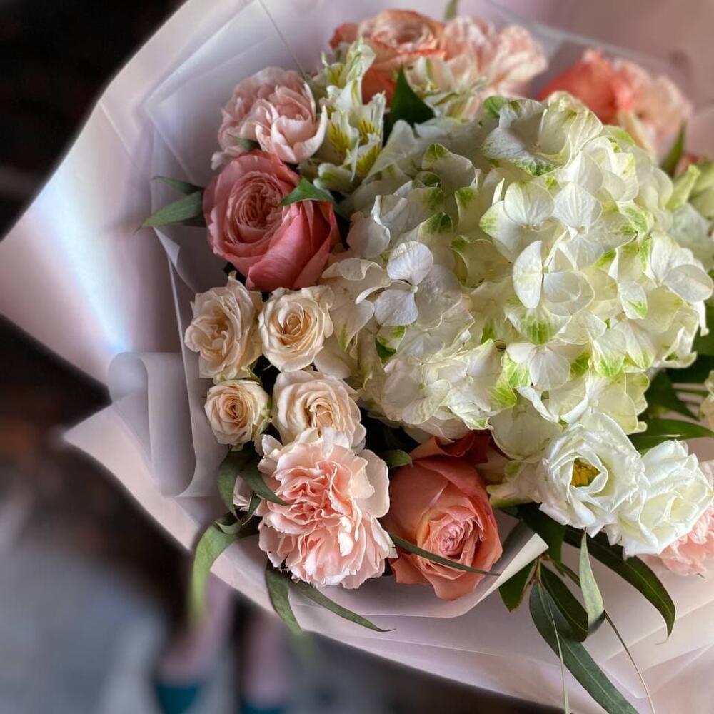 Букет из гортензии, пионовидной розы, эустомы, диантуса, кустовой розы и альстромерии “Летняя нежность”