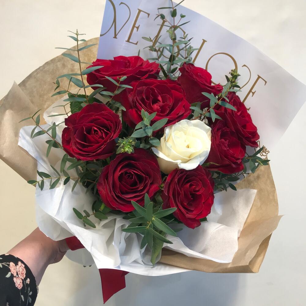 Букет из красных роз, белой розы и эвкалипта