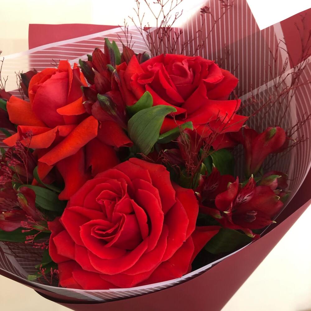 Букет из красных роз с альстромерией и лимониумом