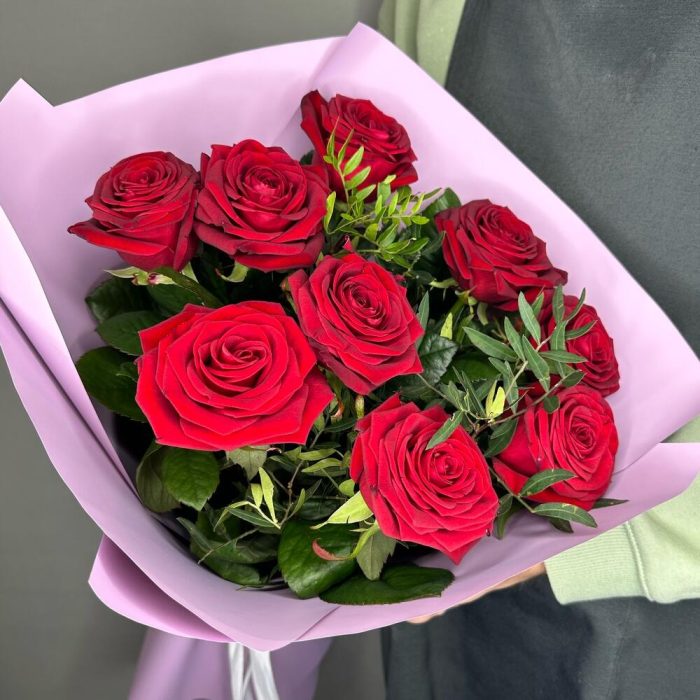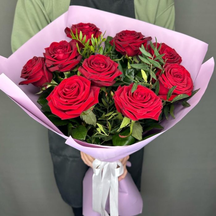 Букет из красных роз с зеленью