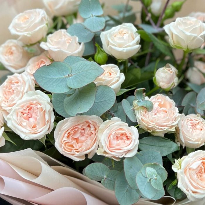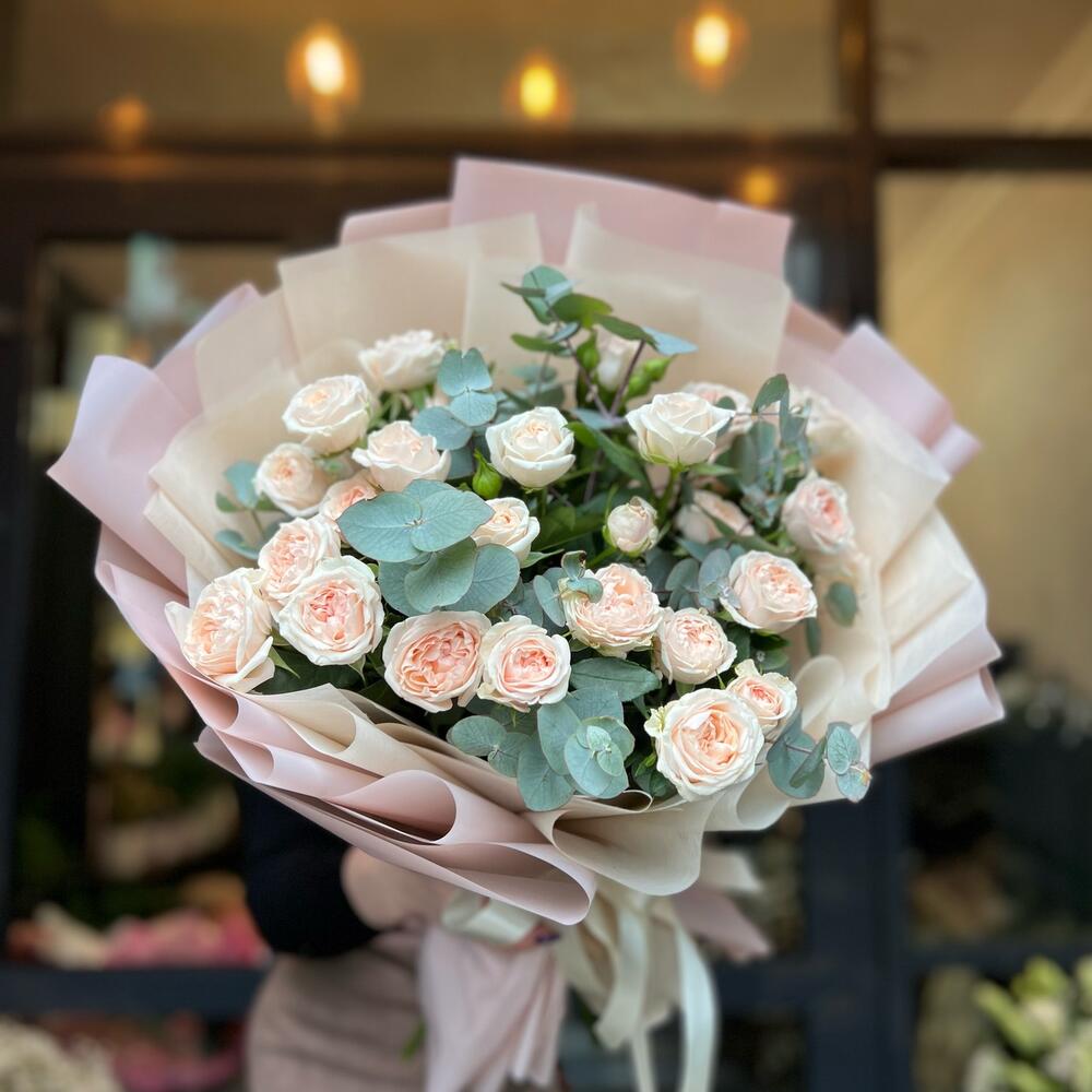 Эвкалипт – 3 шт.Кустовая роза – 5 шт.Атласная лента – 1 шт.декоративная упаковка – 3 шт.