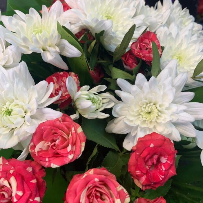 Рускус – 5 шт.Хризантема кустовая – 4 шт.Кустовая роза – 5 шт.Фисташка – 2 шт.Упаковка дизайнерская – 1 шт.