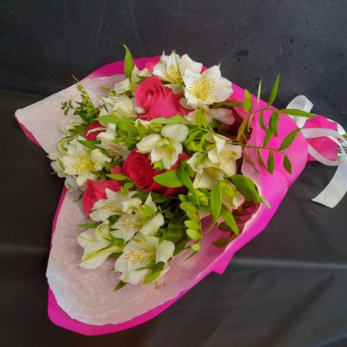 Роза Эквадор – 5 шт.Альстромерия – 7 шт.Фисташка – 3 шт.Тишью – 1 шт.Калька упаковка – 1 шт.Лента атласная – 2 шт.