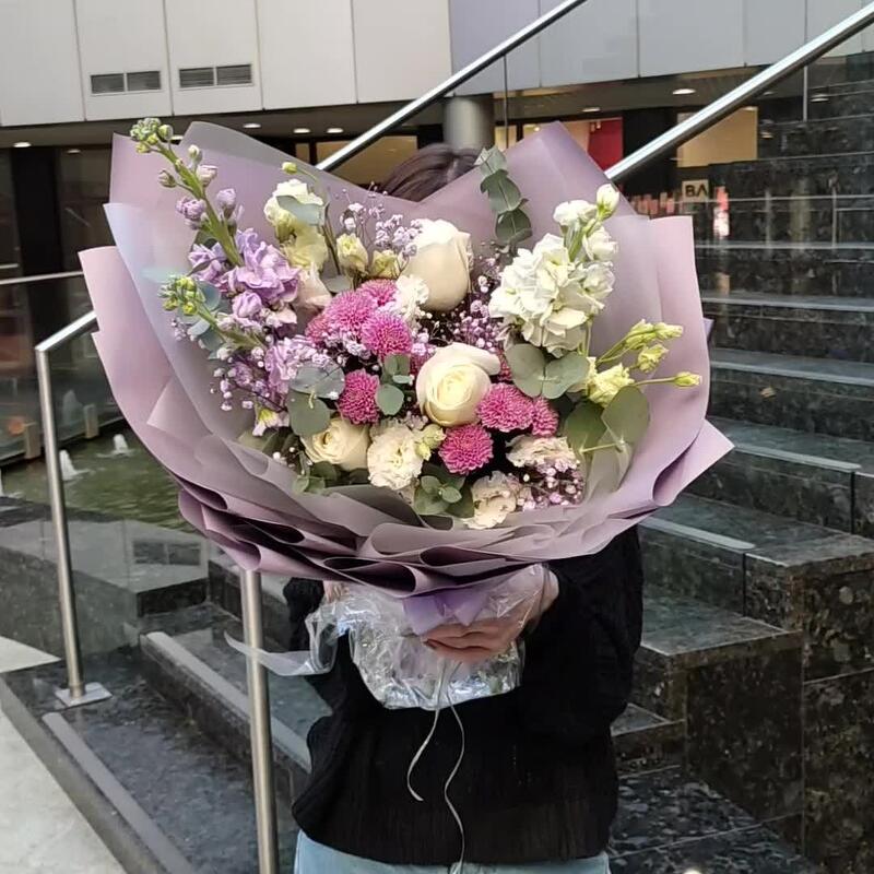 Маттиола – 3 шт.Хризантема кустовая – 2 шт.Лизиантус – 2 шт.Роза – 1 шт.Гипсофила – 1 шт.Эвкалипт – 1 шт.Лента – 2 шт.Упаковка дизайнерская – 2 шт.