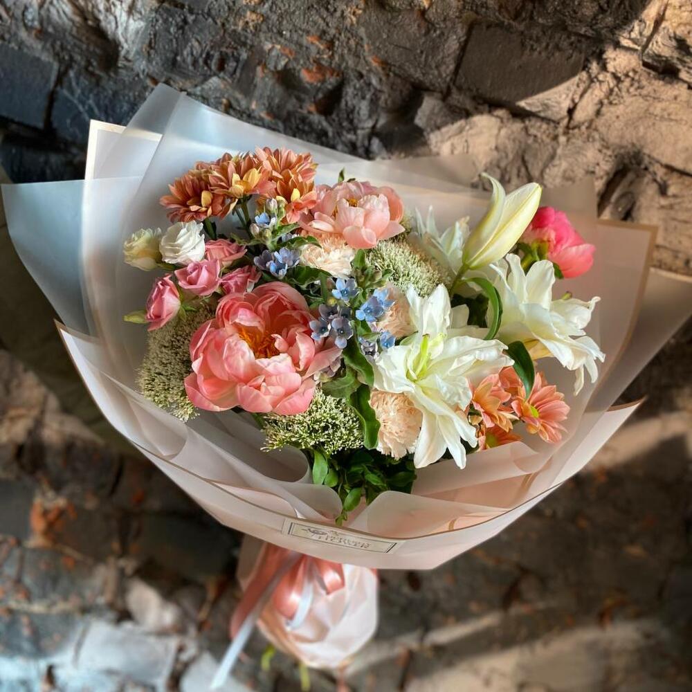 Букет из пионов, трахелиума, кустовых роз, гвоздики, эустомы, твидии, кустовой хризантемы и лилии в стильной упаковке “Офра”