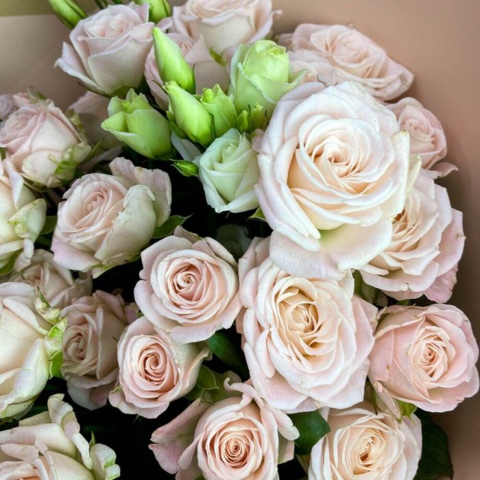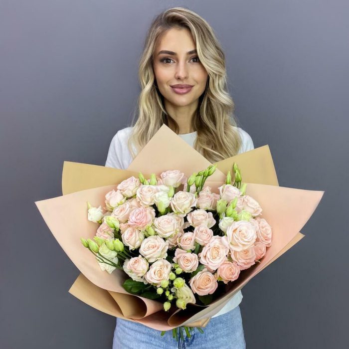 Букет пионовидных роз нежного, кремового оттенка бережно упакованные в крафт упаковку. Пионовидные розы считаются символом романтики и верности. Их полные бутоны отображают множество ярких чувств и любви. Благодаря своей редкой расцветке, превосходным эстетическим данным и аромату их относят к самым красивым сортам.
