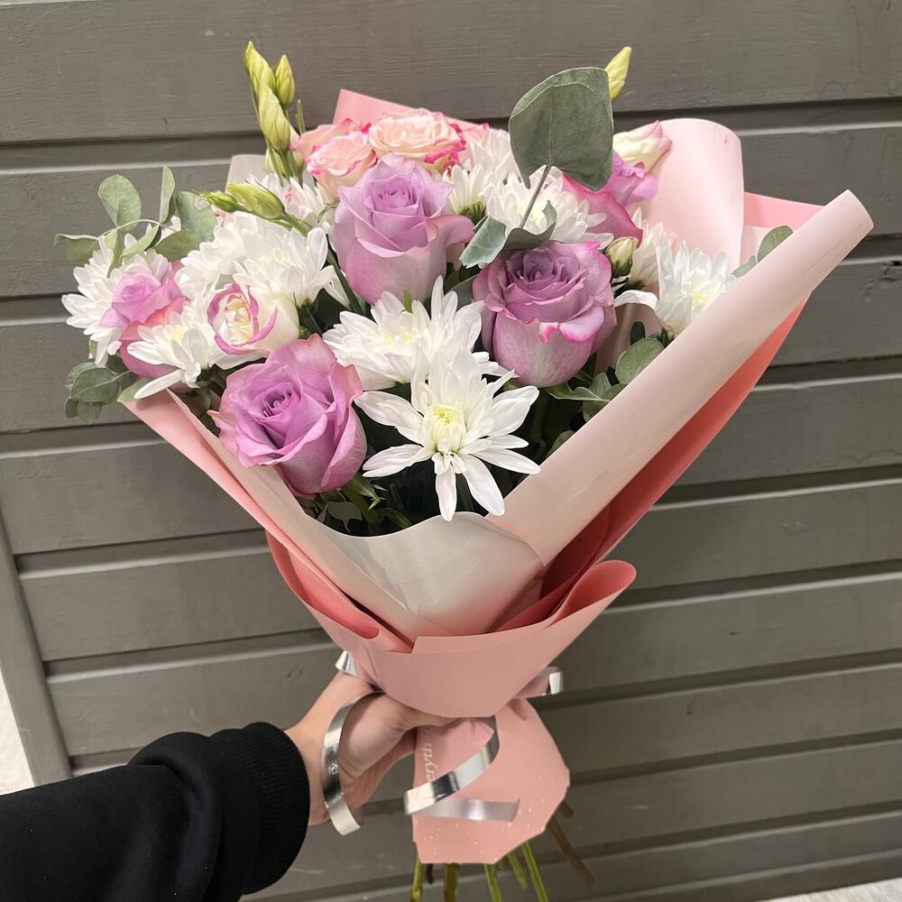 Роза – 5 шт.Хризантема кустовая – 4 шт.Роза кустовая – 1 шт.Эустома – 2 шт.Эвкалипт – 2 шт.Оформление – 1 шт.