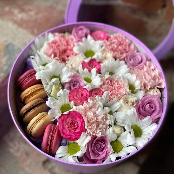 Макарон – 5 шт.Коробка – 1 шт.Хризантема кустовая – 2 шт.Диантус – 5 шт.Роза кустовая – 2 шт.Роза – 5 шт.