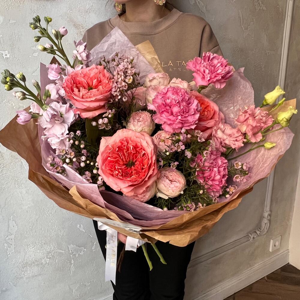 Роза пионовидная – 3 шт.Роза пионовидная кустовая – 2 шт.Гвоздика – 3 шт.Маттиола – 2 шт.Ваксфлауэр – 3 шт.Лизиантус – 1 шт.Упаковка дизайнерская – 1 шт.