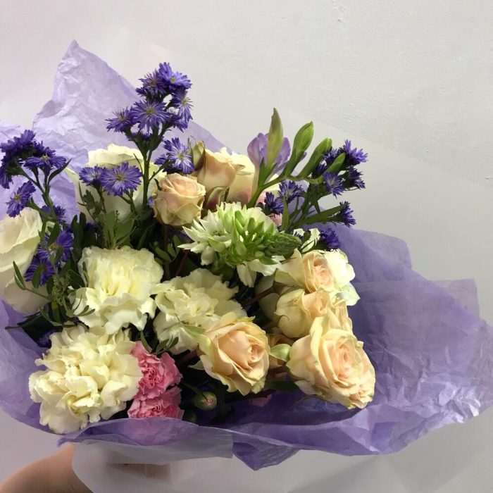 Роза Мондиаль – 4 шт.Гвоздика – 5 шт.Астра – 3 шт.Орнитогалум – 1 шт.Фрезия – 1 шт.Роза кустовая – 2 шт.Фисташка – 1 шт.Упаковка дизайнерская – 1 шт.Лента атласная – 1 шт.открытка с вашими пожеланиями – 1 шт.