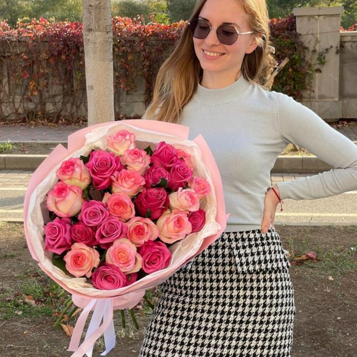 Шикарный микс из двух видов розовой розы. Свежесть цветов Вас приятно удивит. Заказывайте с доставкой по Тбилиси.
