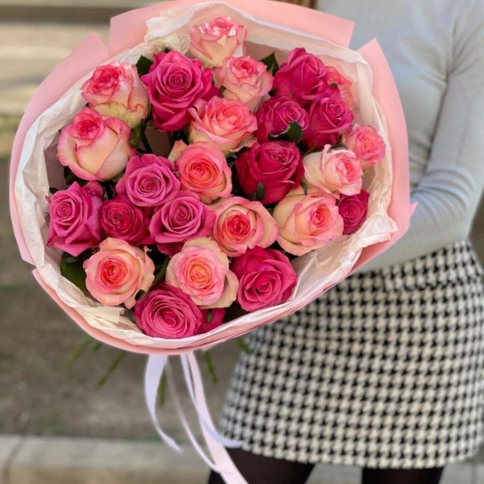 Упаковка – 1 шт. Атласная лента – 1 шт. розовая микс роза – 25 шт.
