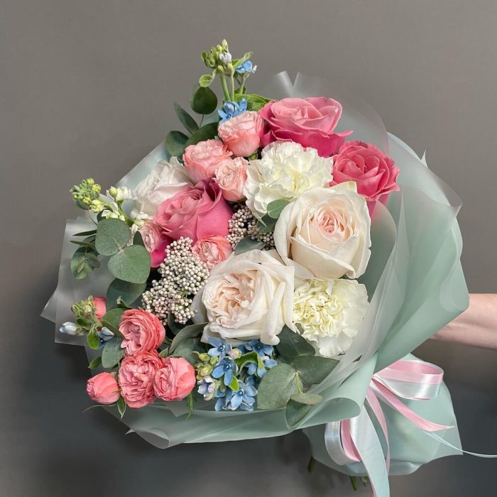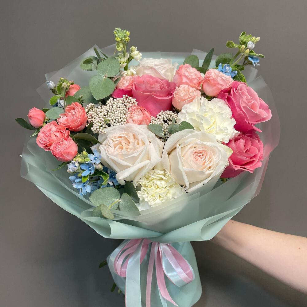 Роза Охара – 3 шт.Роза пионовидная розовая – 3 шт.Гвоздика – 3 шт.Бомбастик роза – 3 шт.Маттиола – 1 шт.Озотамнус – 2 шт.Оксипеталум – 3 шт.Эвкалипт – 3 шт.Упаковка дизайнерская – 2 шт.Лента атласная – 2 шт.
