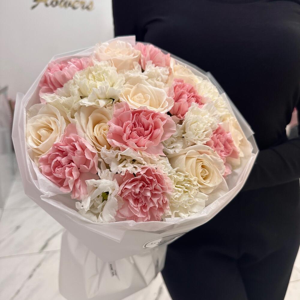 Роза Эквадор – 7 шт.Диантус – 11 шт.Лизиантус – 3 шт.Авторская упаковка – 4 шт.