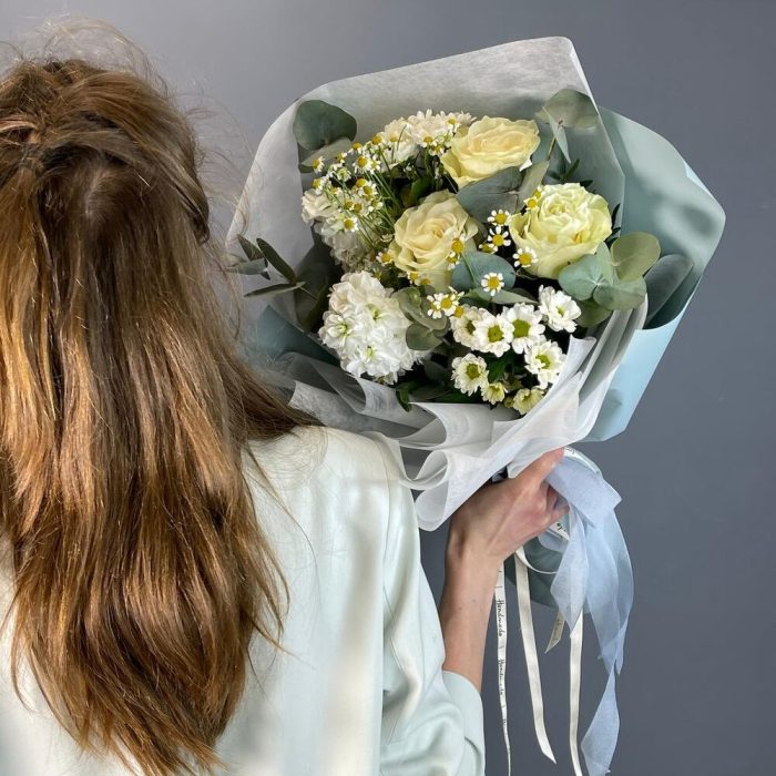 Лента – 1 шт.Маттиола – 2 шт.Хризантема Сантини – 2 шт.Эвкалипт – 1 шт.Упаковка – 1 шт.Матрикария – 4 шт.Фисташка – 2 шт.Роза Мондиаль – 3 шт.