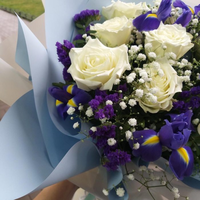 Лента – 2 шт.Статица – 1 шт.Ирис Blue Magic – 5 шт.Пленка матовая – 2 шт.Гипсофила Мирабелла 95 г – 1 шт.роза кения 50 см – 9 шт.