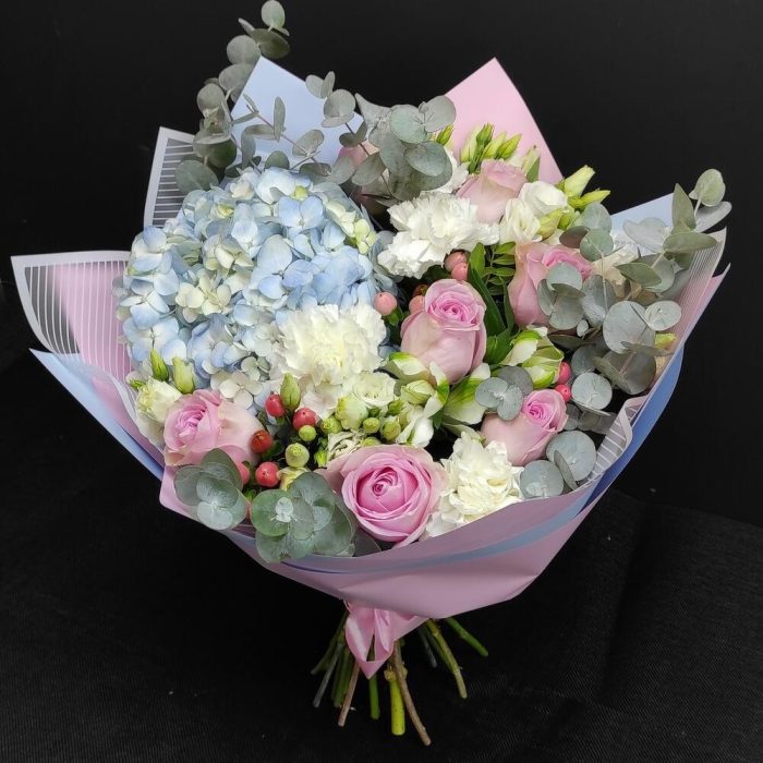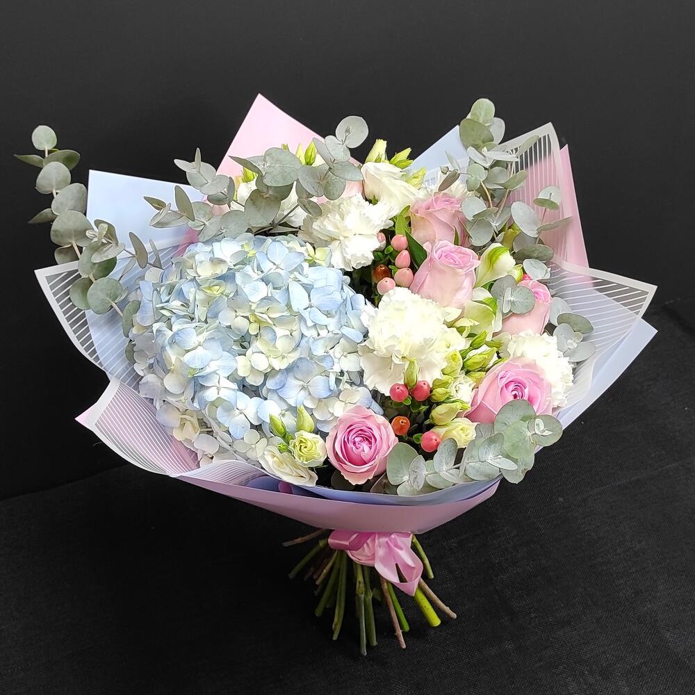 Гортензия – 1 шт.Роза – 7 шт.Диантус – 5 шт.Эустома – 2 шт.Гиперикум – 3 шт.Эвкалипт – 2 шт.Фисташка – 1 шт.Дизайнерская упаковка – 3 шт.Альстромерия – 2 шт.