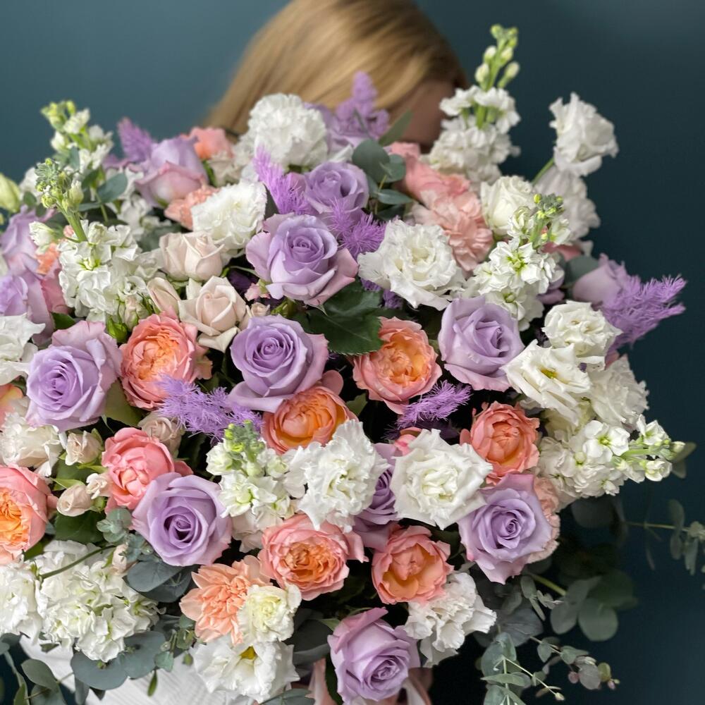 Гипсофила – 3 шт.Лаванда – 10 шт.Лента – 3 шт.Лизиантус – 10 шт.Маттиола – 8 шт.Эвкалипт – 3 шт.Роза одноголовая – 11 шт.Коробка шляпная – 1 шт.Аспарагус – 1 шт.Фисташка – 3 шт.Роза кустовая пионовидная – 5 шт.Оазис флористический – 1 шт.Гвоздика одноголовая – 11 шт.