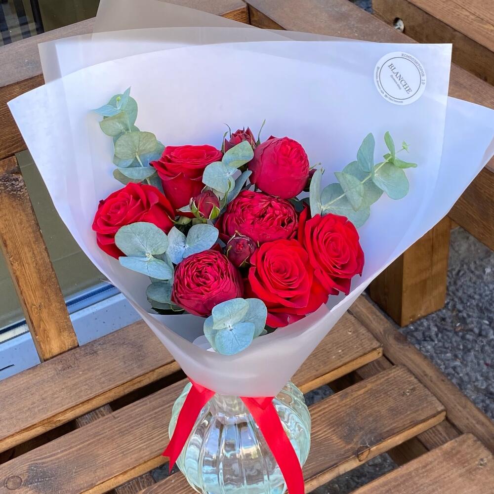 Red Piano кустовая роза – 3 шт.Красная роза – 4 шт.Эвкалипт – 5 шт.Фирменная упаковка – 1 шт.