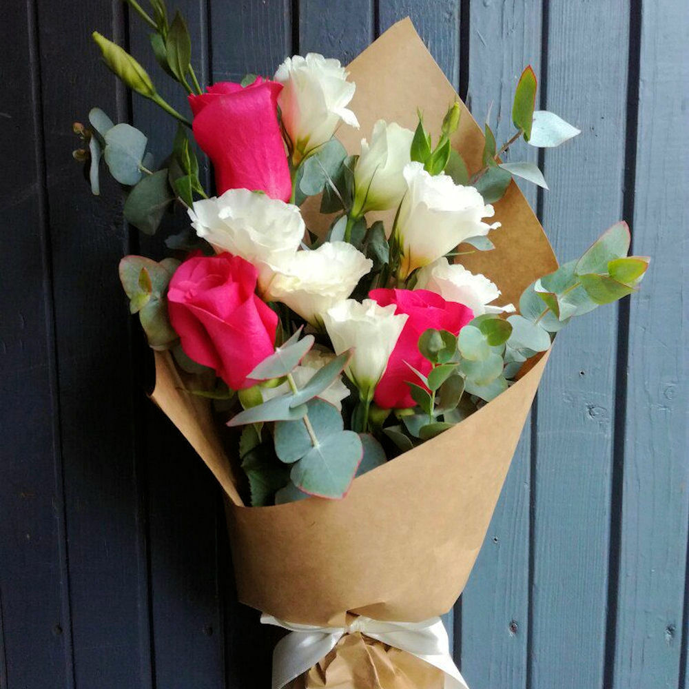Роза – 3 шт.Эустома – 3 шт.Эвкалипт – 2 шт.Крафт – 1 шт.
