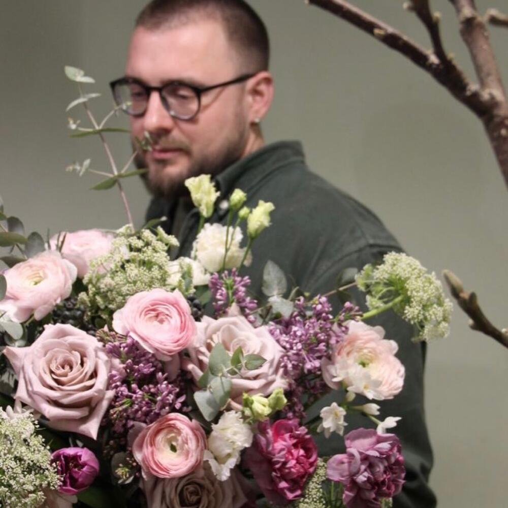 Тюльпан сортовой – 3 шт.Сирень – 3 шт.Нарцисс кустовой – 3 шт.Ранункулюс (лютик) – 5 шт.Роза сортовая – 3 шт.Лизиантус – 5 шт.Гвоздика – 3 шт.Амми – 4 шт.Колючка – 1 шт.Эвкалипт – 9 шт.Лента – 1 шт.