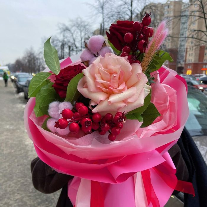 Роза красная – 2 шт.Хлопок – 2 шт.Лента атласная – 4 шт.Тишью – 4 шт.Французская роза – 1 шт.Ягоды декоративные – 3 шт.Пленка матовая – 6 шт.Фисташка пучок – 1 шт.Салал пучок – 1 шт.колосок полевой – 1 шт.