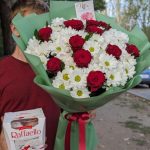 Роза красная – 11 шт. Хризантема белая – 10 шт. Современная упаковка – 1 шт. конфеты рафаэлло. – 1 шт.