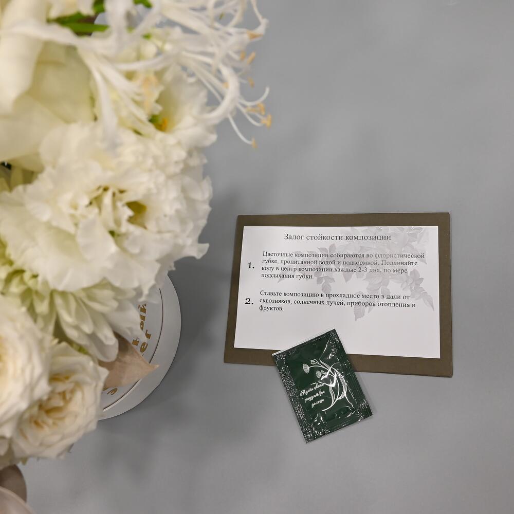 Хризантема – 1 шт.Магнолия – 2 шт.Эустома – 2 шт.Рускус – 3 шт.Роза кустовая – 3 шт.Гвоздика – 2 шт.Нерина – 1 шт.Сантини – 2 шт.Французская роза – 2 шт.Шляпная коробка – 1 шт.