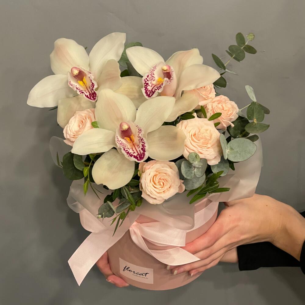 Орхидея Цимбидиум – 3 шт.Роза кустовая – 2 шт.Эвкалипт – 3 шт.Фисташка – 2 шт.Шляпная коробка – 1 шт.Оазис – 1 шт.