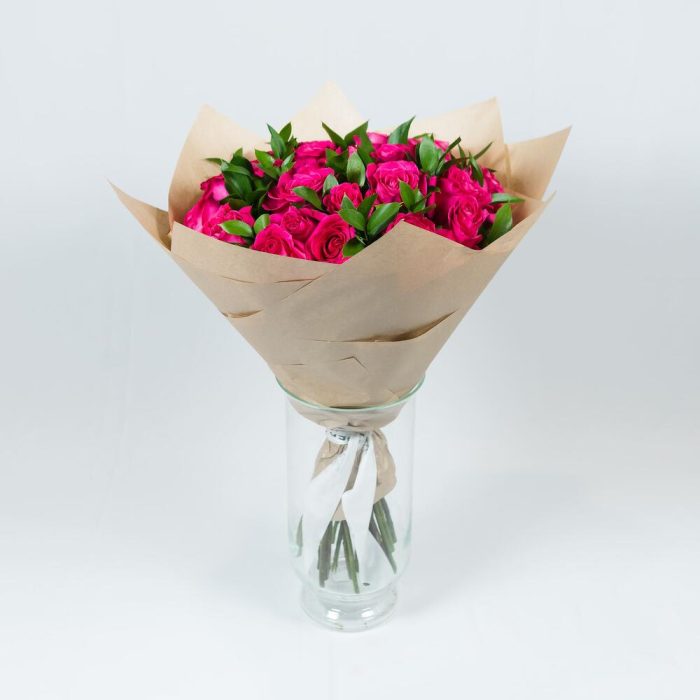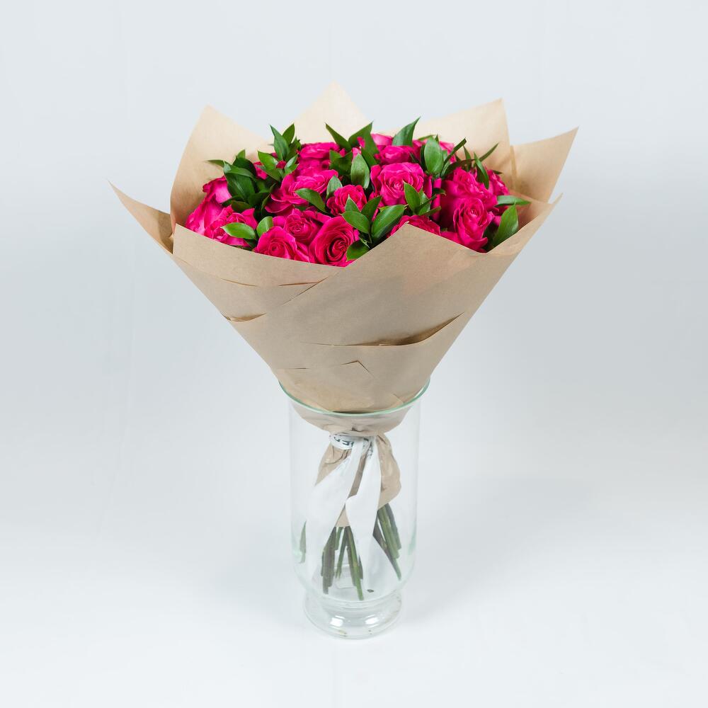 Роза эквадор Pink Floyd – 25 шт.Рускус – 8 шт.Крафт упаковка – 1 шт.Лента атласная – 1 шт.