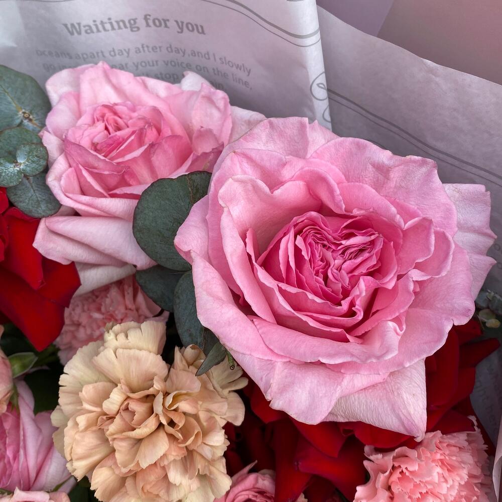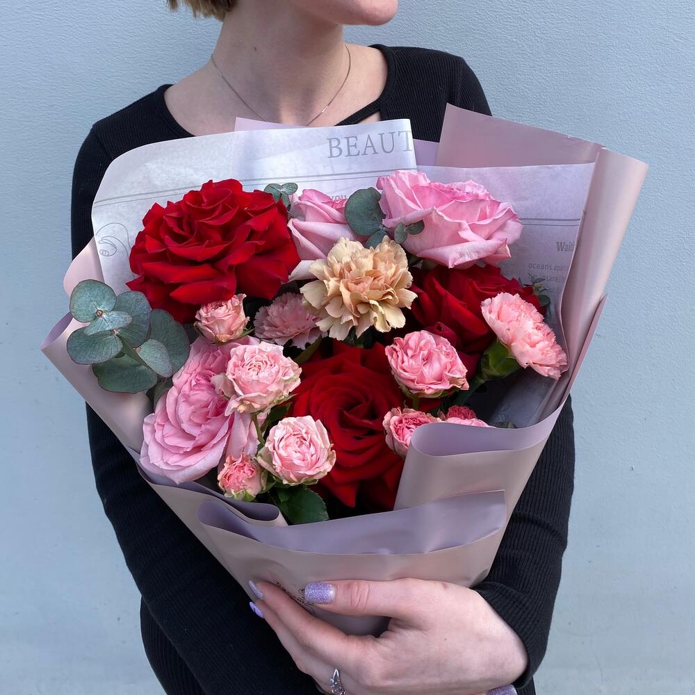 Роза pink o’hara – 3 шт.Роза французская – 3 шт.Роза бомбастик кустовая – 2 шт.Диантус – 3 шт.Эвкалипт – 1 шт.Тишью – 1 шт.Пленка дизайнерская – 1 шт.Лента атласная – 1 шт.