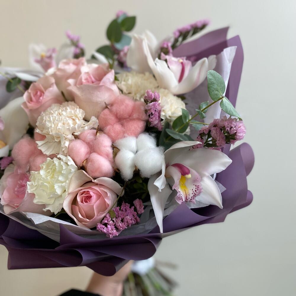 Орхидея Цимбидиум – 5 шт.Статица – 6 шт.Эвкалипт – 4 шт.Роза Эквадор – 5 шт.Лента атласная – 5 шт.Фисташка – 5 шт.Упаковка дизайнерская – 9 шт.Хлопок натуральный – 4 шт.Диантус сортовой – 5 шт.