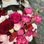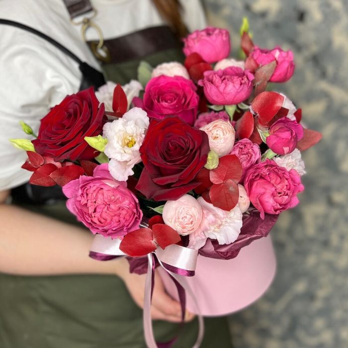 Роза Pink Floyd – 1 шт.Роза Эксплорер – 2 шт.роза пионовидная кустовая джульетта церайз – 1 шт.роза пионовидная кустовая мэнсфилд парк – 1 шт.эустома розовая – 1 шт.Эвкалипт – 2 шт.Оазис флористический – 1 шт.Коробка шляпная – 1 шт.Лента атласная – 2 шт.