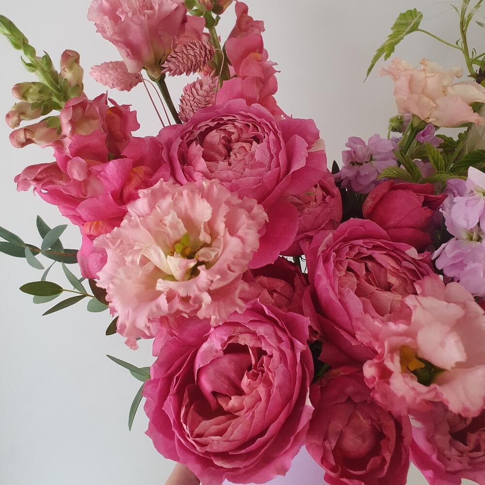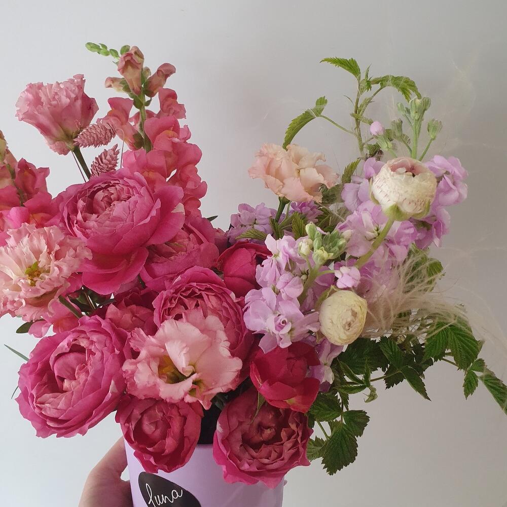 Коробка шляпная – 1 шт.Роза Джульетта – 2 шт.Лизиантус – 1 шт.антиринум – 2 шт.Маттиола – 3 шт.Ранункулюс – 2 шт.