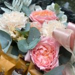 Роза кустовая пионовидная – 1 шт.Диантус – 2 шт.Лизиантус – 1 шт.Папоротник – 2 шт.Лента – 2 шт.Упаковка дизайнерская – 2 шт.