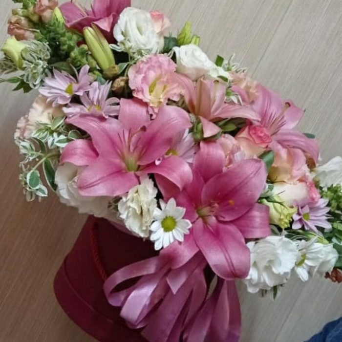 Лилия розовая – 1 шт. Роза Джумилия – 3 шт. Львиный зев розовый – 4 шт. Лизиантус Алиса белый – 3 шт. Хризантема кустовая – 1 шт.