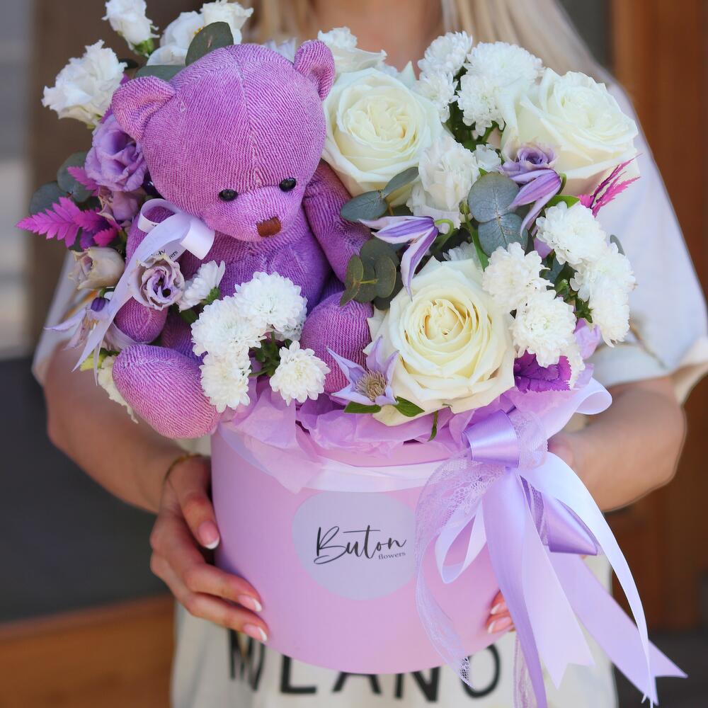 Нежная, чувственная и воздушная композиция с мишкой, выполненная из пионовидных роз, лизиантуса, клематиса, сантини и других не менее интересных цветов.А сиреневый мишка, который входит в состав композиции, сделает Ваш цветочный подарок ещё более уникальным и индивидуальным!Такая композиция точно понравится яркой и энергичной получательнице, и будет долго радовать её.К композиции прилагается открытка с вашими пожеланиями и приятный комплимент от нашего магазина – шоколадка.Мы также будем рады отправить вместе с композицией конфеты, шоколад ручной работы или б/а вино по вашим пожеланиям, просто напишите нам в личные сообщения. Заказывая нашу композицию, Вы всегда получите исключительный сервис и заботу о клиенте