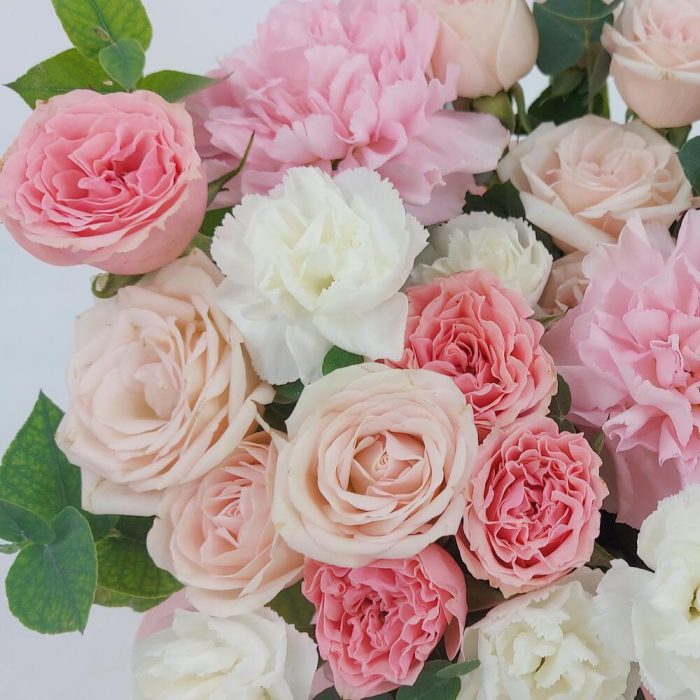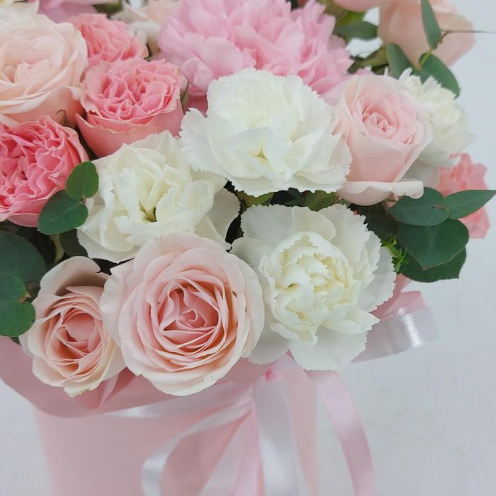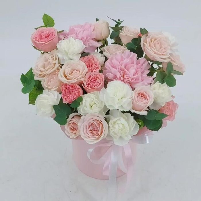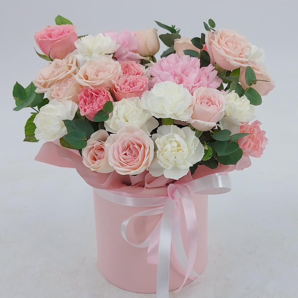 Нежные кустовые розочки, диантусы и эвкалипт в коробке. Такой презент всегда уместен и подойдёт для любого повода: День Рождения, именины, годовщина свадьбы, рождение ребенка, 8 марта, День Святого Валентина, выпускной и т.д. Можно вручить маме, сестре, подруге, коллеге, учителю, любимой.