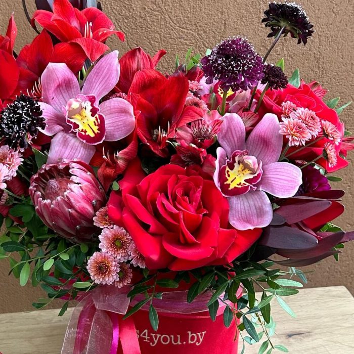 левкадендрон – 3 шт. ЦИМБИДИУМ – 3 шт. Роза французская – 5 шт. амариллис красный – 2 шт. Скабиоза стелата – 3 шт. Протея африка – 1 шт. ленты атласные – 2 шт. альстромерия бордо – 5 шт. коробка бархатная брендированная – 1 шт. хризантема сантини осенняя – 5 шт.
