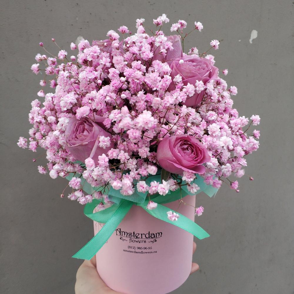 Роза кустовая пионовидная – 5 шт.Гипсофила розовая – 3 шт.Коробка d12 – 1 шт.Оазис – 1 шт.Упаковка – 1 шт.Лента – 1 шт.
