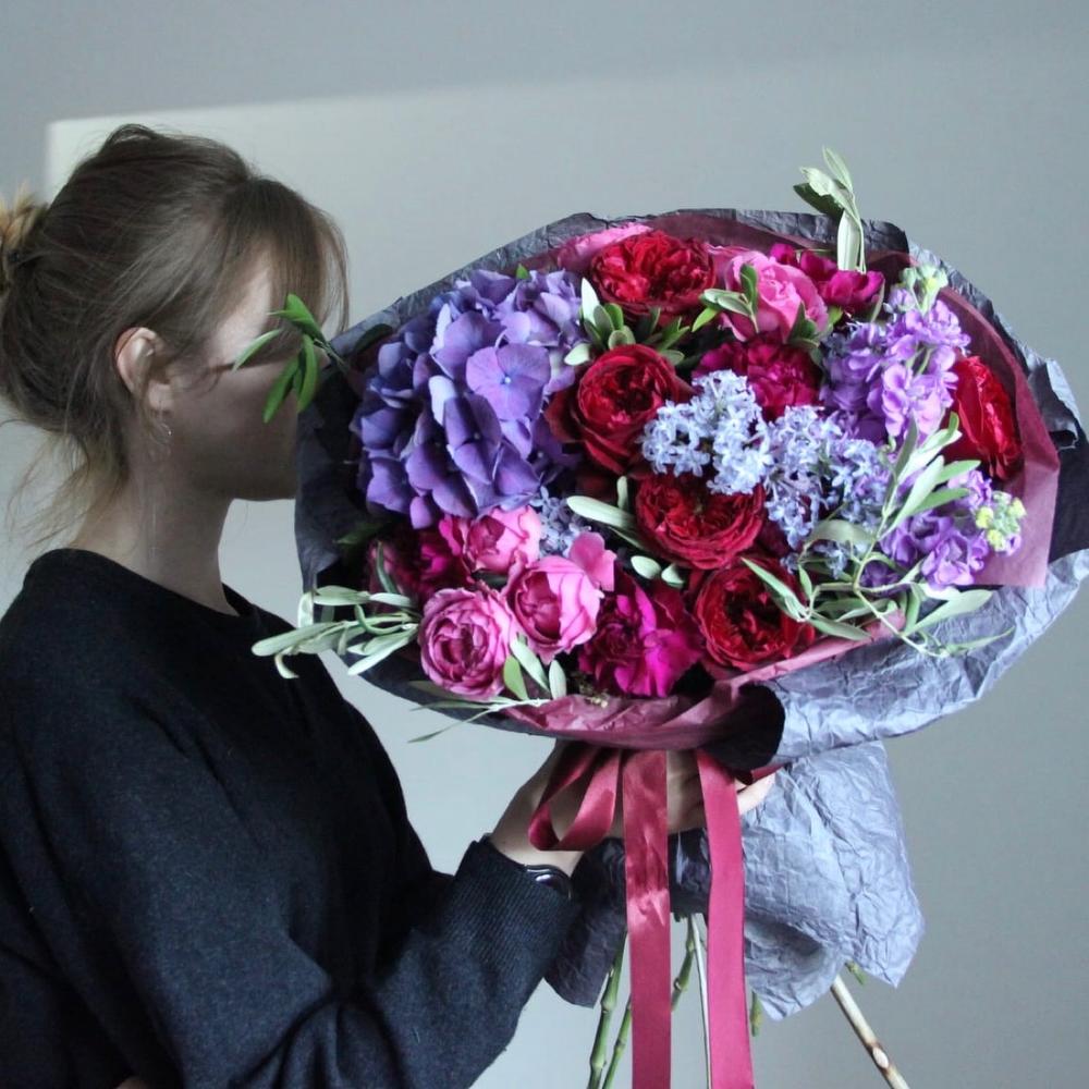 Маттиола – 4 шт.Роза пионовидная – 7 шт.Роза пионовидная кустовая – 3 шт.Гвоздика – 5 шт.Олива – 5 шт.Гортензия – 1 шт.Упаковка – 1 шт.