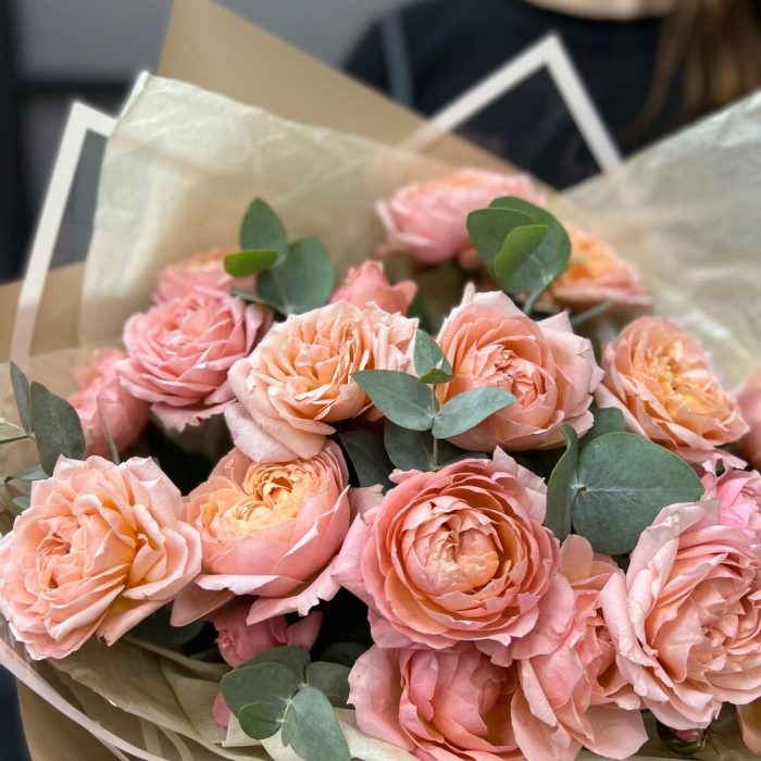 роза пионовидная кустовая джульетта черри – 5 шт.Эвкалипт – 3 шт.Тишью – 2 шт.пленка дизайнерская с каймой – 2 шт.Пленка матовая – 4 шт.Лента атласная – 2 шт.
